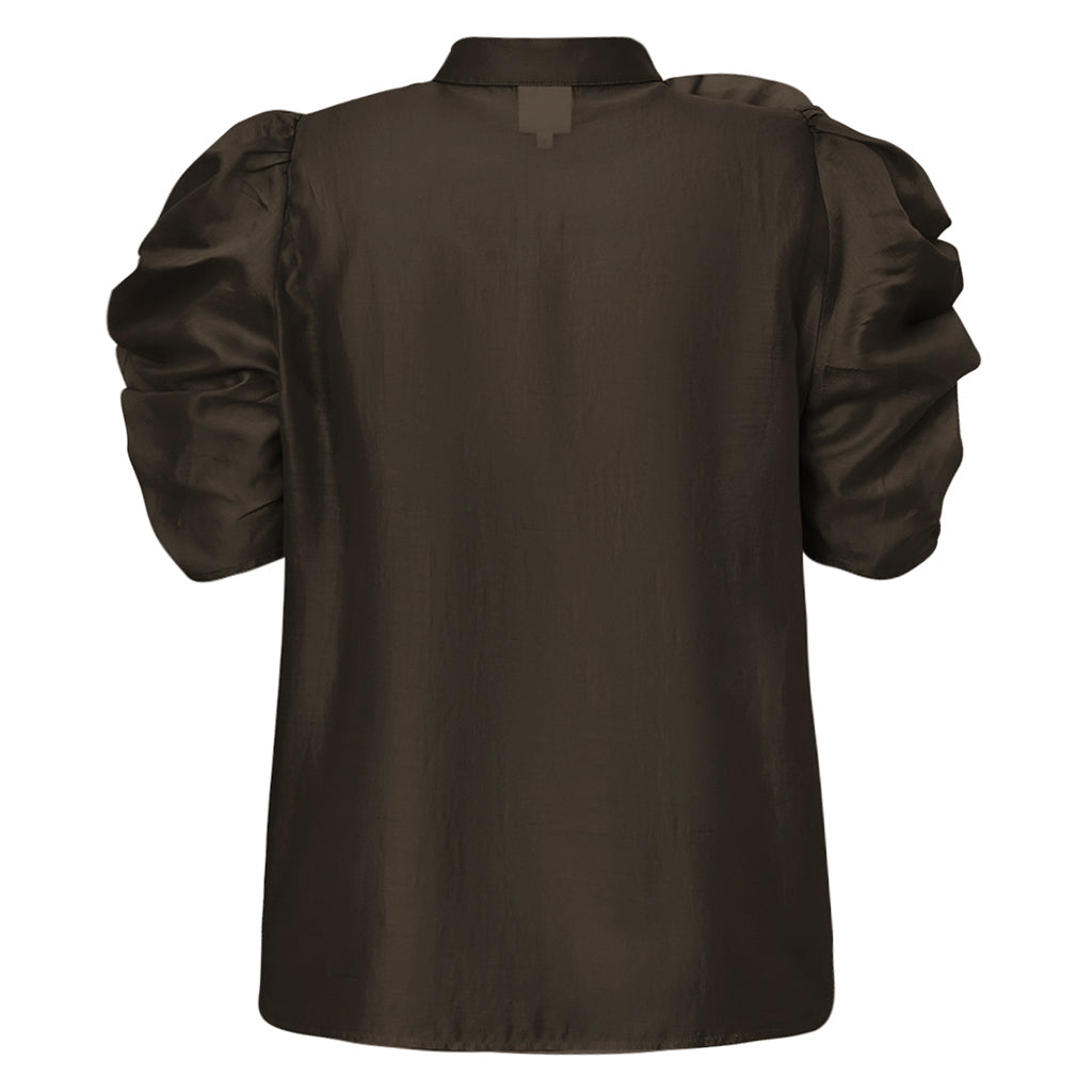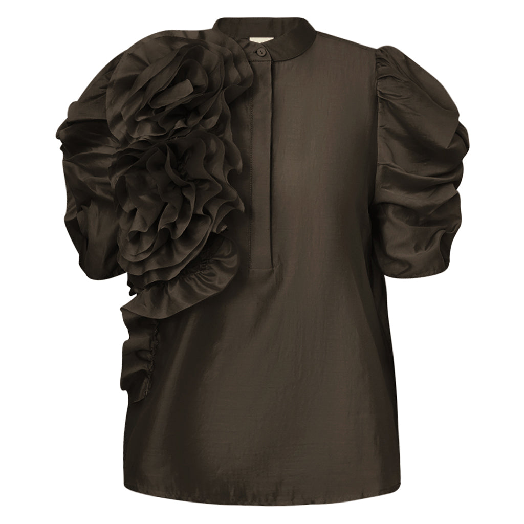 85% Lyocell - 15% Polyester, AnnsofieGO Blouse er en smuk bluse med korte ærmer, der har en markant puffet effekt, hvilket giver en dramatisk og moderne silhuet. Ærmerne er voluminøse og skaber et stilfuldt look. Blusen har en høj hals der lukkes med en knap foran samt en meget dekorativ blomst på den ene side. Bryst: XS/100 cm, S/104 cm, M/108 cm, L/114 cm, XL/120 cm Længde: XS/63 cm, S/64 cm, M/65 cm, L/66 cm, XL/67 cm