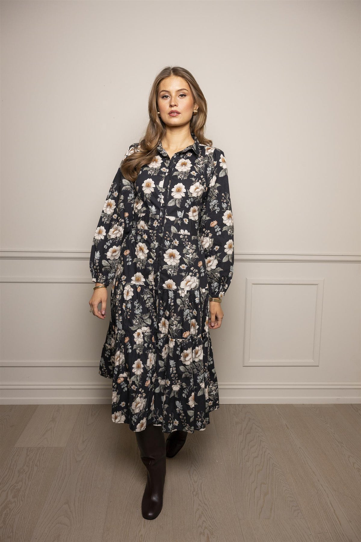 Vicky Midi Dress Antique Black Poplin fra Missmaya, Vicky Midi Dress Antique Black Poplin fra Missmaya med klassisk skjorte krave, lange ermer med strikk nederst og kappedetaljer. Kjolen har strikk bak for god passform og gjennomgående knappestolpe, oppleves som normal på størrelsen.