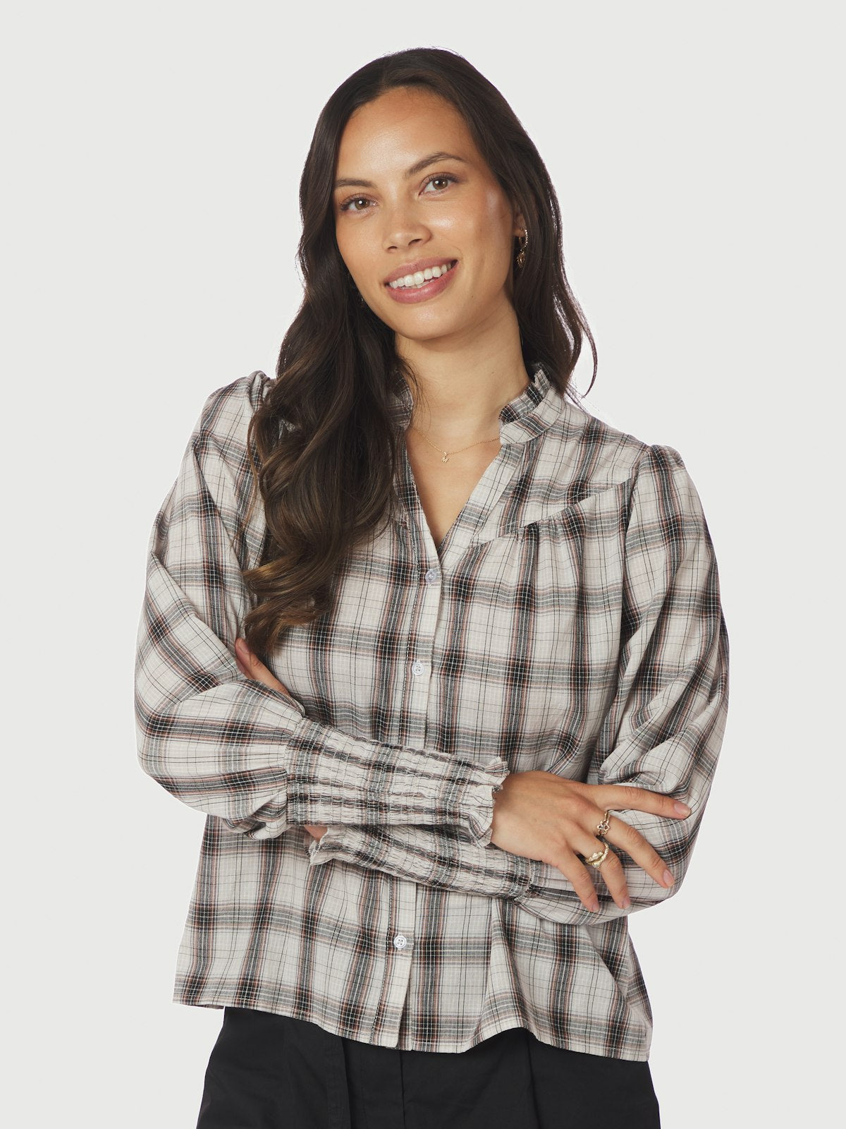 Camisa Big Check Blouse er en stilren og komfortabel bluse laget av 100% bomull. Den off-white fargen gir et friskt og elegant preg, perfekt for både hverdagsbruk og mer formelle anledninger.