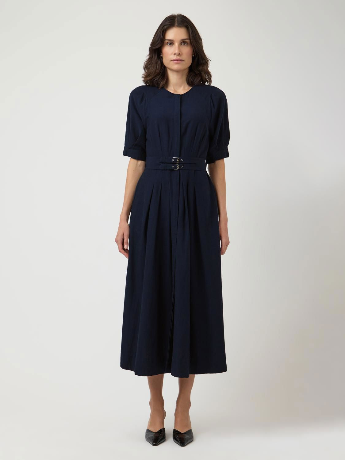 YASMARUMA 2/4 LONG DRESS S. er en elegant og komfortabel kjole i en dyp mørkeblå farge, perfekt for spesielle anledninger. Den er laget av bærekraftige materialer som gir både stil og komfort.